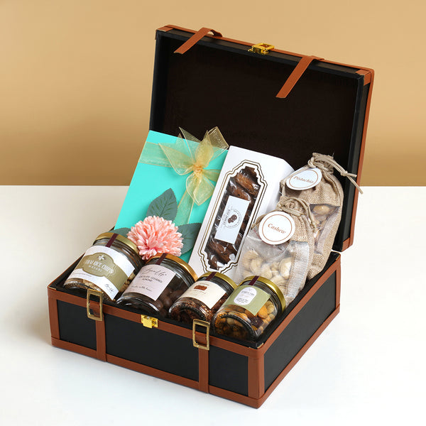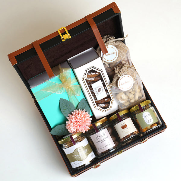 The Crunch Trunk is filled with an assortment of gourmet treats like premium nuts, artisanal chocolates, crunchy cookies, and savoury snacks. Each item is chosen to suit a wide range of taste preferences.