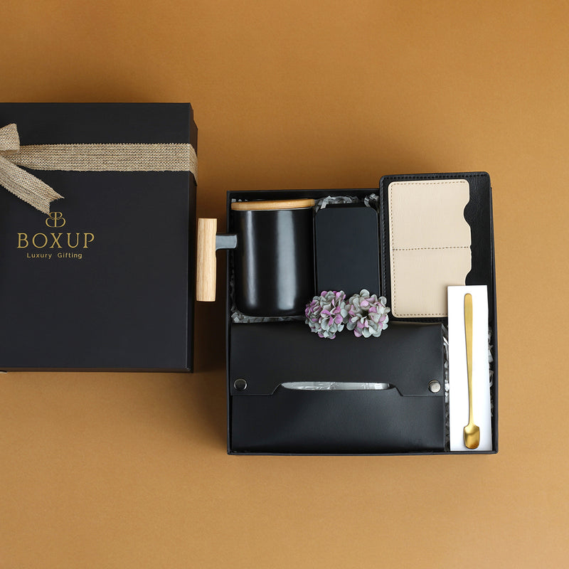 Draped in timeless black, The Luxe Noir hamper is a celebration of sophistication and power. Curated with premium, all-black essentials, it’s bold, sleek, and made to impress.