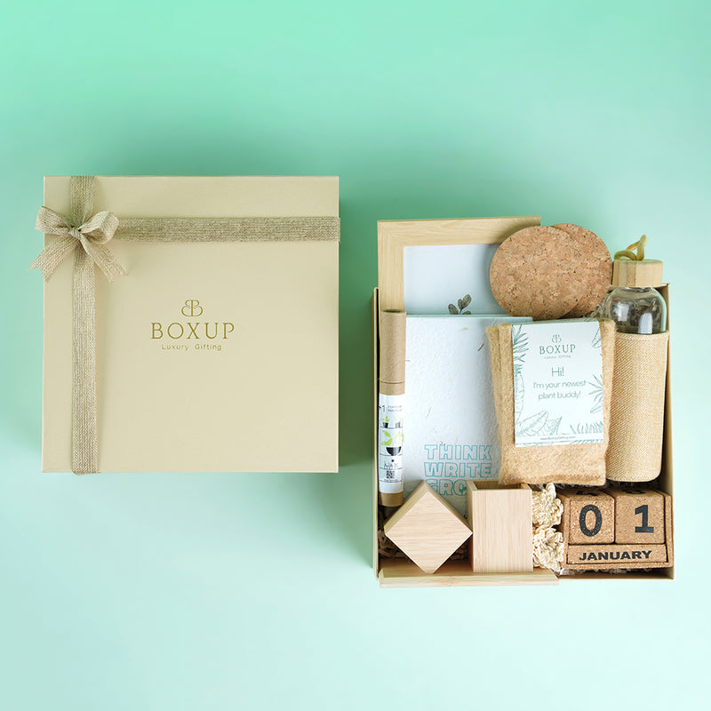A seed journal encourages thoughtful notes and reflections, and the glass bottle with a jute sleeve completes the experience with everyday utility and charm. Finished with a custom card, The Earthy Choice is designed for those who value sustainability wrapped in elegant simplicity.