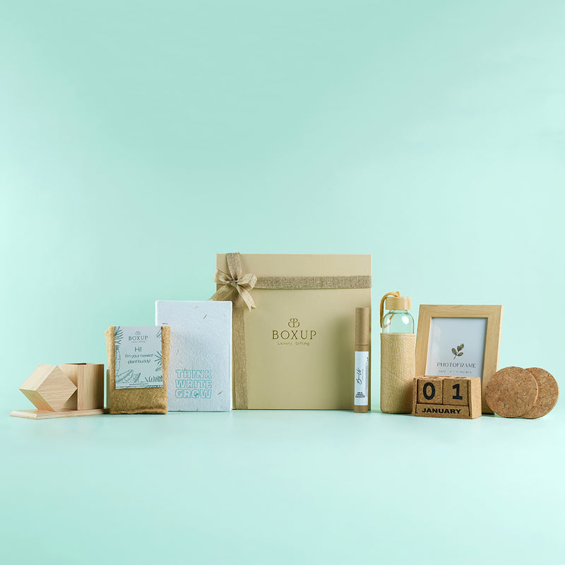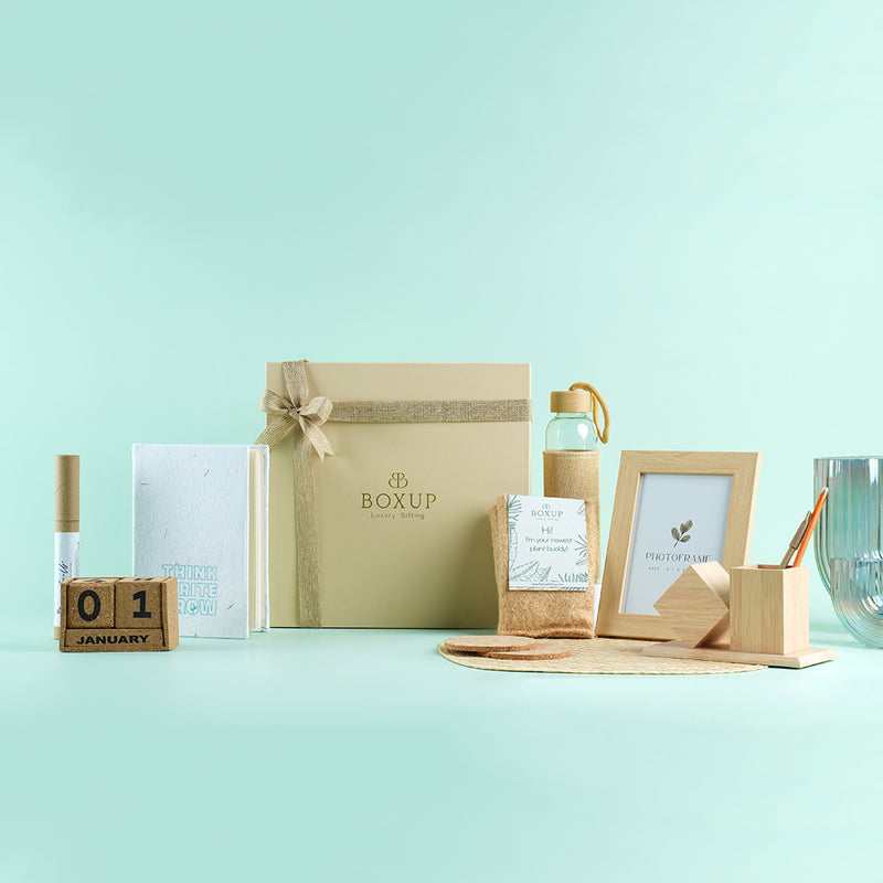 The Earthy Choice is a conscious curation that celebrates sustainability, simplicity, and timeless design. Thoughtfully assembled in a reusable box, this hamper brings together eco-friendly essentials that inspire mindful living and meaningful workspaces.