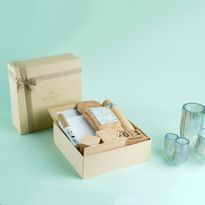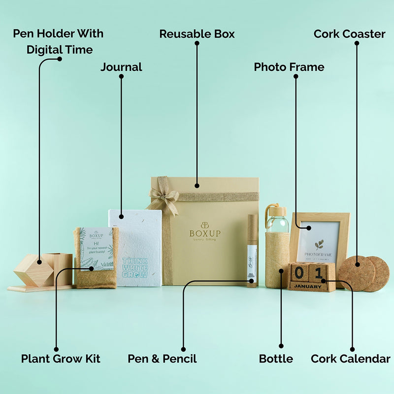 Inside, you’ll find a handcrafted wooden pen stand, a plant grow kit to add a touch of green to any desk, and seed pens and pencils that grow into herbs once used. A cork desk calendar and matching cork coasters add warmth and natural texture, while a wooden photo frame offers space to treasure memories.