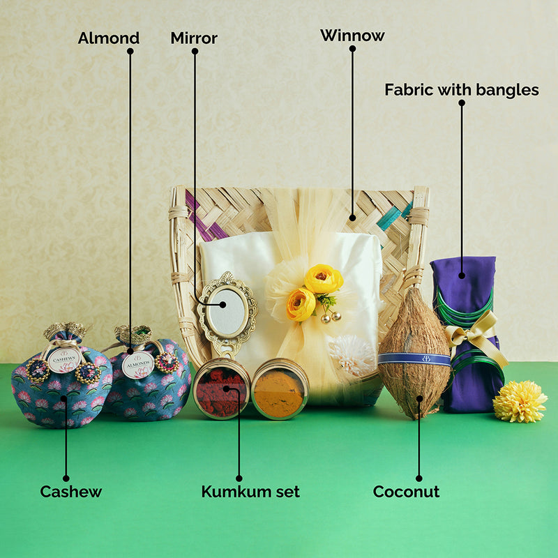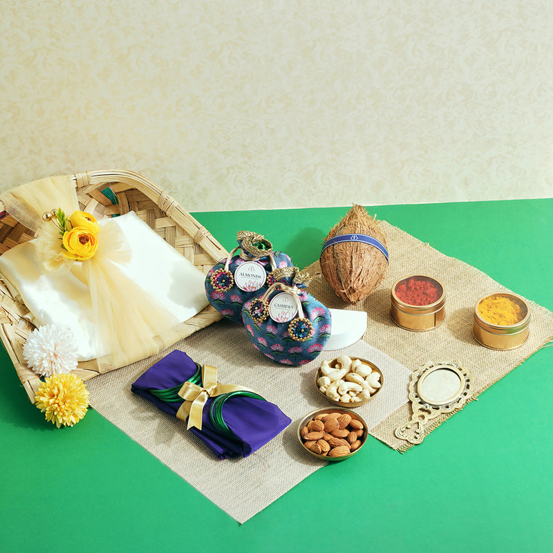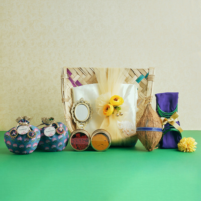 It includes a traditional handheld mirror, fabric with blouse piece and bangles, cashews and almonds in potli bags, a kumkum and haldi set, and a ceremonial coconut. Each element symbolises prosperity and blessings, making it a meaningful return gift for a truly special occasion.