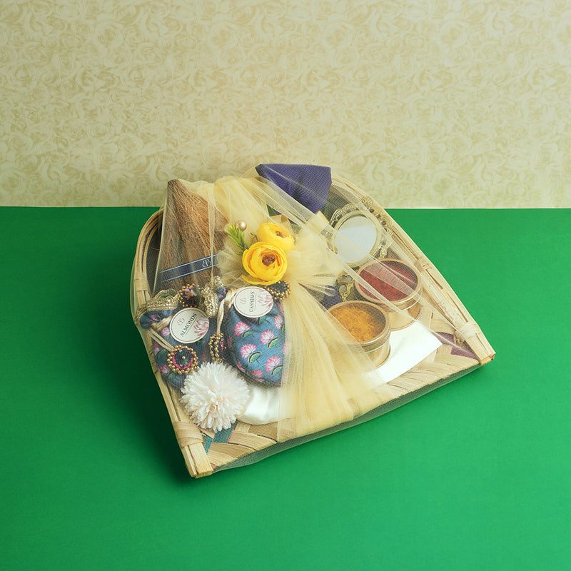 A celebration of auspicious beginnings, The Mangala Vaibhavam Collective brings together elements deeply rooted in South Indian wedding tradition. Thoughtfully arranged in a bamboo winnow, this hamper reflects abundance, grace, and cultural richness.