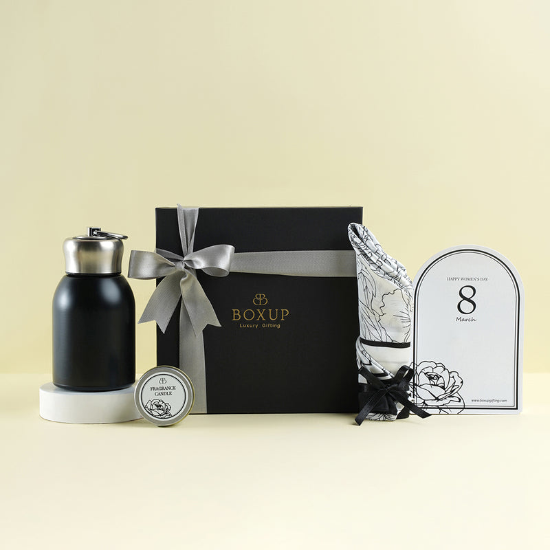 Featuring the sleek Noir water flask, the softly scented Dusk fragrance candle, and a luxurious satin scarf, each element adds a touch of sophistication to daily routines. Finished with a custom card, The Chic Woman Hamper is a perfect choice for Women’s Day, appreciation gestures, or thoughtful gifting that feels stylish yet effortless.