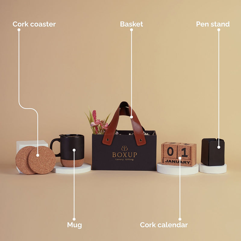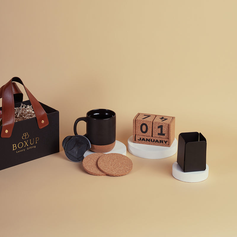 A coffee mug with cork detailing pairs warmth with practicality, complemented by a set of cork coasters for a naturally refined touch. The cork calendar offers a minimalist way to stay on schedule, while the sleek metal pen stand keeps your desk effortlessly organised.