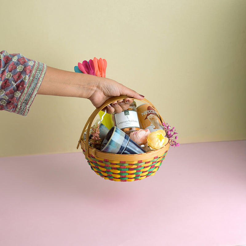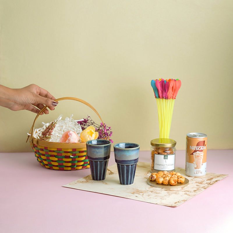 Inside, you’ll find a charming set of ceramic ‘cutting chai’ cups, water balloons for a splash of fun, gourmet makhana for light snacking, and a refreshing Nescafe iced latte to keep the energy going. Perfect for festive gifting, this basket blends tradition, treats, and celebration in the most delightful way.