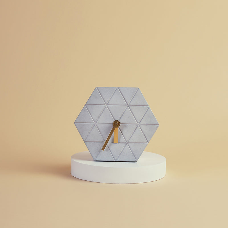 A modern timepiece mounted on a concretehexagon tile. Minimal, artistic, anda strikingaddition to any desk or side table.
