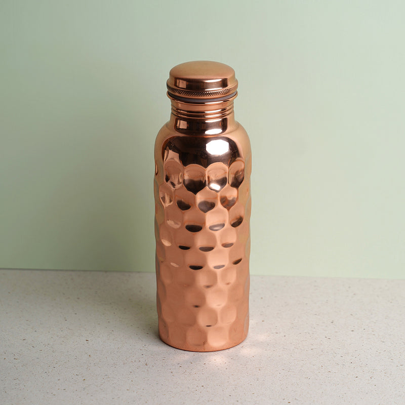 Enrich your daily water intake with the essence of copper with this water bottle made from pure copper. The body showcases a beaten texture, giving it an attractive visual appeal.