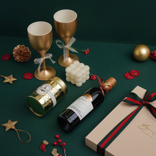 December is here, time for cheer and celebrations! Chilly Nights will be filled with meeting family and friends to reminisce and the dining table is set for the conversations that will make it a memorable night, and what better present to give to your loved ones than our “A Holly Jolly Christmas” Gift Box? The classic Christmas Eve night with a beautiful bottle of Big Banyan wine poured in beautiful Gold wine Glasses, paired with delicious Christmas chocolate Chip Cookies and an aromatic Bubble Candle to toast for good fortune and a merry Christmas.
