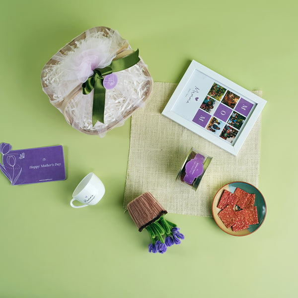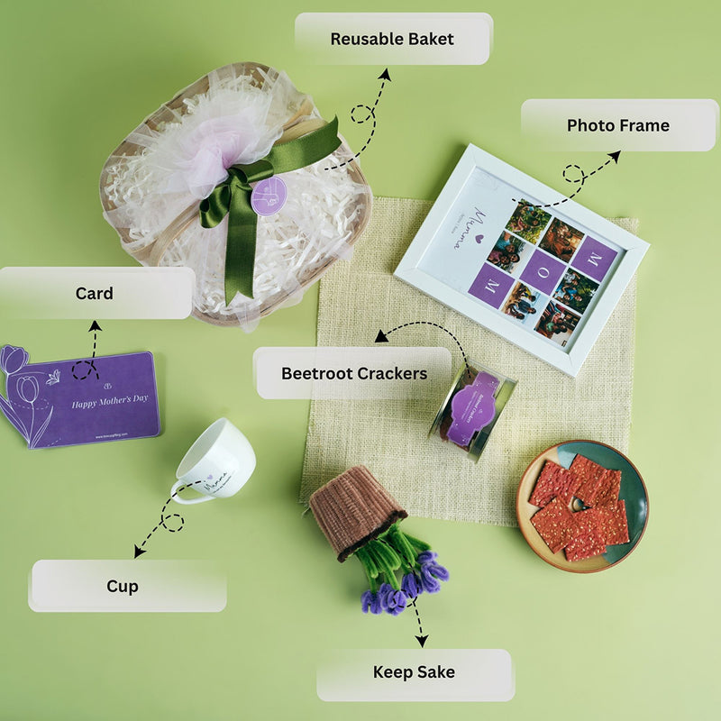 Inside, you’ll find wholesome beetroot crackers paired with a Mumma’s tea cup for cosy moments, along with a delicate lavender flower pot that adds a soothing touch. A personalised photo frame completes the hamper, making it a heartfelt gift that celebrates love, memories, and everything she means to you.