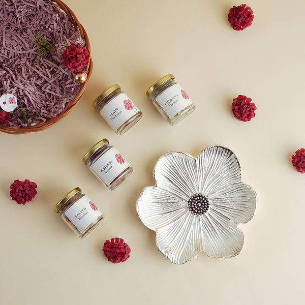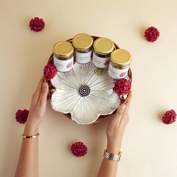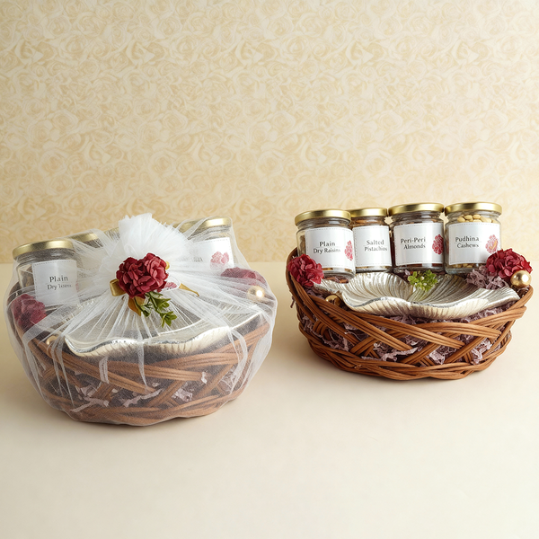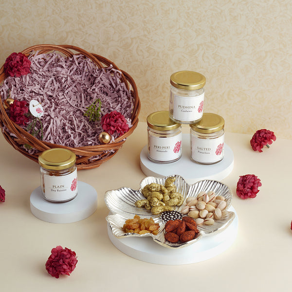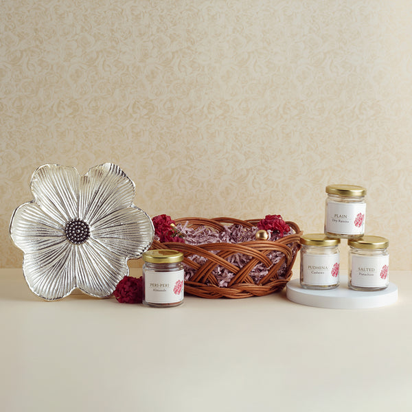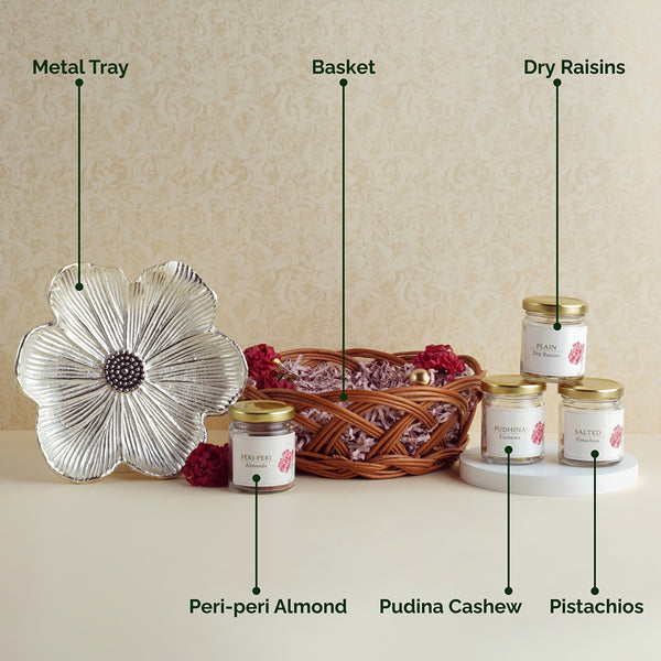 A Little Something is a thoughtfully curated hamper designed to make everyday gifting feel special. Presented in a charming cane basket, it brings together elegant serveware and flavourful dry fruits, including pudhina cashews, peri peri almonds, raisins, and pistachios. Finished with a floral metal tray and a custom card, this hamper is perfect for expressing gratitude, celebrating small moments, or sharing a warm gesture.