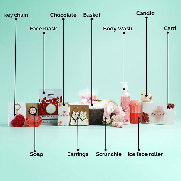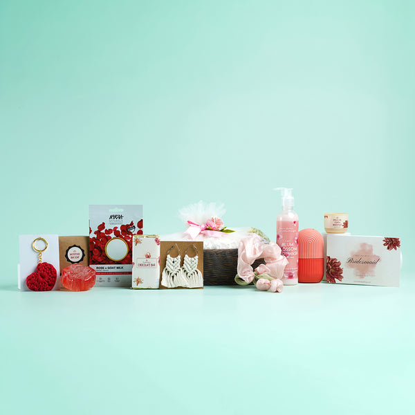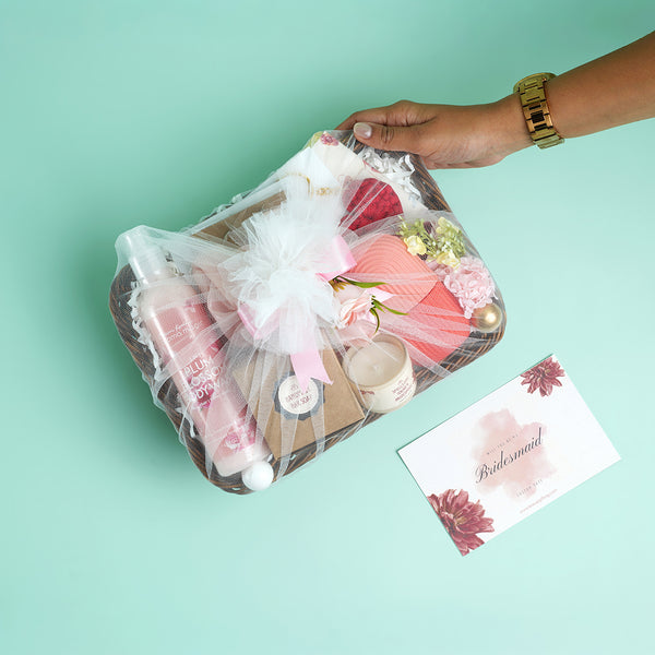 The Bride Squad Basket is a fun and feel good hamper curated especially for the women who stand by the bride through every moment. Thoughtfully packed in a cane basket, it includes pampering essentials, playful accessories, and little indulgences, from body care and beauty treats to a cosy candle and sweet chocolate.