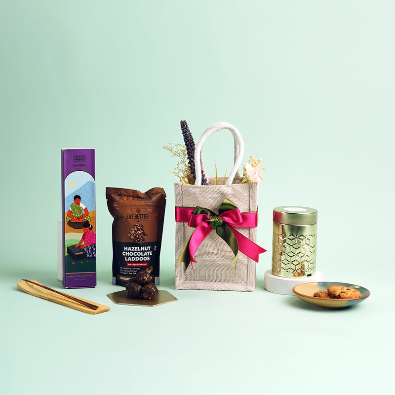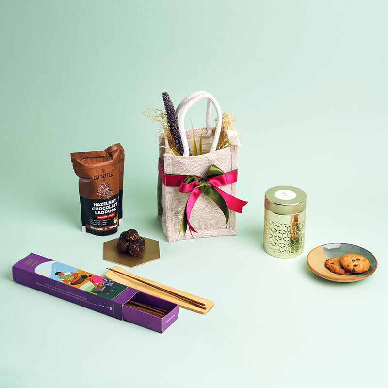 Inside, you’ll find soothing incense sticks to set a serene mood, rich Eat Better hazelnut chocolate laddoos, and delightful choco chip cookies for sweet indulgence. Perfect for festive gifting or heartfelt gestures, this hamper balances flavour, fragrance, and simplicity in the most beautiful way.