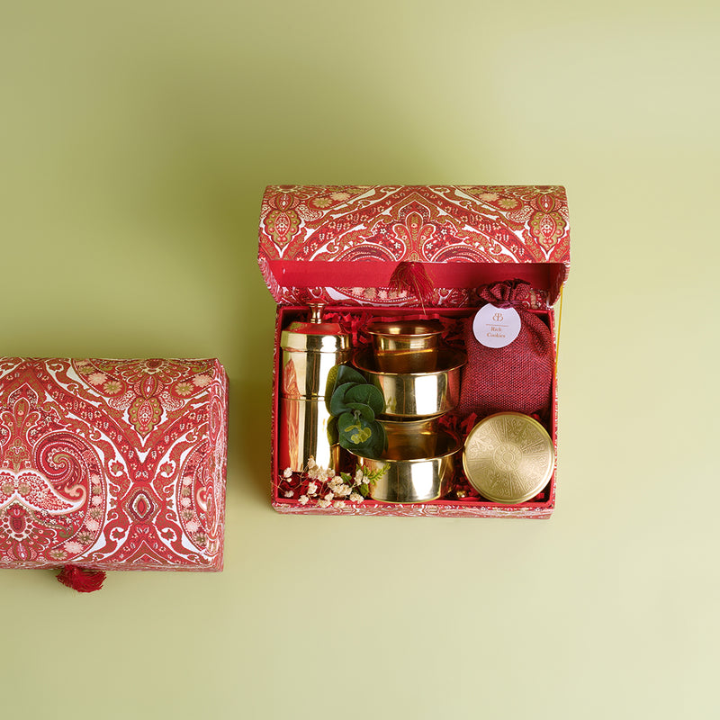 A tribute to timeless traditions, The Sanskriti Hamper brings together elements that celebrate the warmth of Indian hospitality and heritage. Presented in a classic trunk box, this hamper reflects the charm of cultural rituals and everyday indulgence.